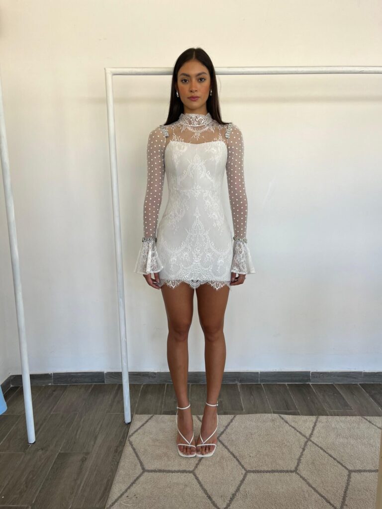 El “Floral Lace Dress” es un vestido mini de encaje con un olán en la parte delantera. Importante: Esta prenda forma parte de nuestra sección OUTLET. Por esta razón, no se aceptan cambios ni devoluciones.