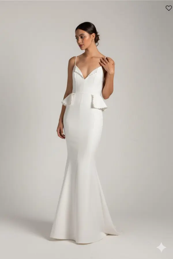 The Helen Ruffle Gown presents a classic yet sensual silhouette in the front, featuring a fitted figure and a plunging V-neckline that enhances the neckline. The back is where the fun begins, showcasing voluminous ruffles with hand-embroidered details along the seams that cascade from the waist down. It fastens with a zipper located at the back.