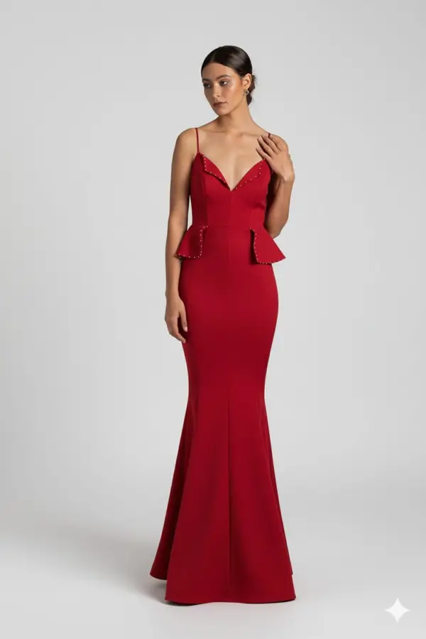 The Helen Ruffle Gown presents a classic yet sensual silhouette in the front, featuring a fitted figure and a plunging V-neckline that enhances the neckline. The back is where the fun begins, showcasing voluminous ruffles with hand-embroidered details along the seams that cascade from the waist down. It fastens with a zipper located at the back.
