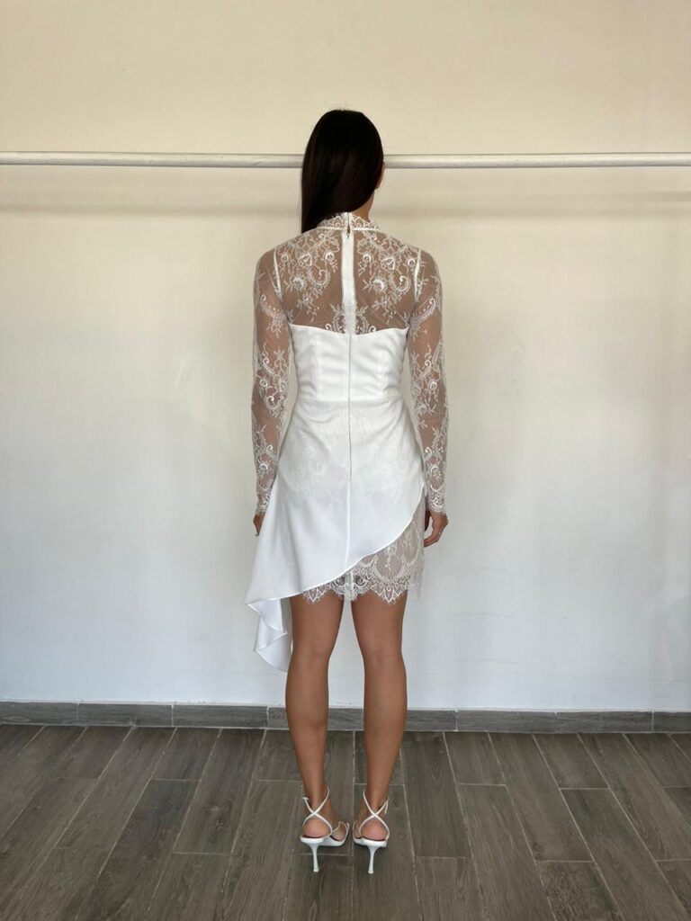 The “Bow Down Midi Dress in Ivory” is a classic one-shoulder silhouette that stands out with its exaggerated bow on the shoulder and its leg slit. Its zip for closure is located at the back.