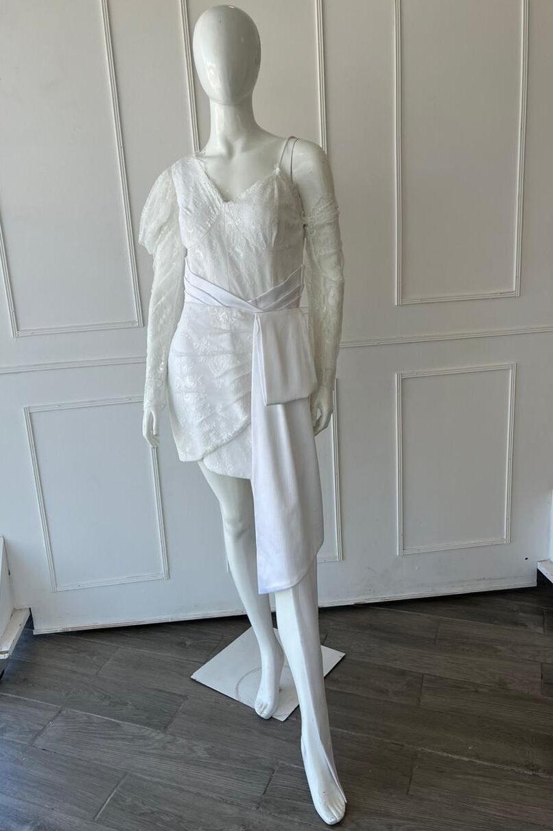 The “Feather Bombshell Dress in Ivory” features a strapless midi dress that embraces all the curves. It has a side slit, and for a touch of drama, feathers run along the neckline. Zip closure in the back.