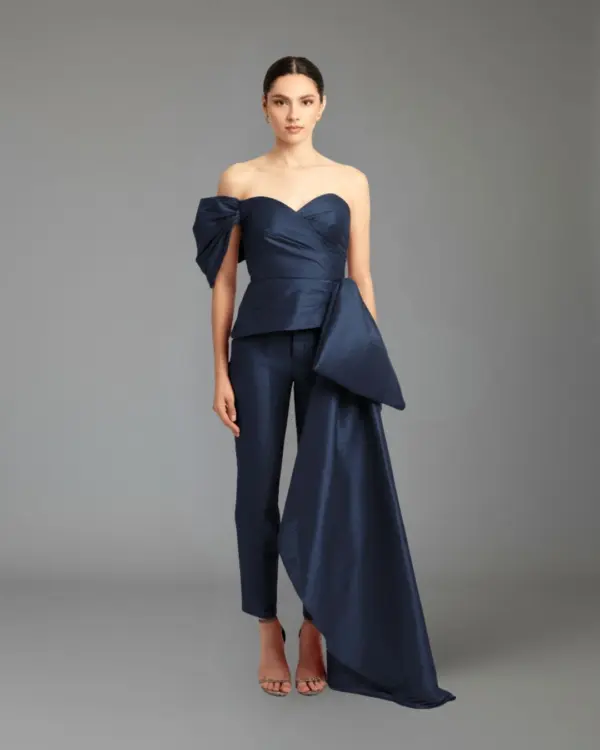 Designed for a grand entrance: The Monroe Set. Featuring a strapless draped top with a floor-sweeping side bow for maximum drama, paired with our signature cigarette pants. Iconic, intense, and made for you.