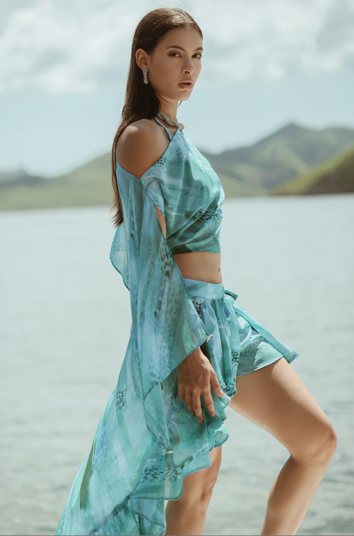 The Mist Top defines summer lightness and elegance. Featuring a cape-like silhouette and ultra-flowy sleeves, this crop top stands out with its asymmetrical drape that feels like a cool breeze, making it the perfect match for the Saphire Skirt to create a stunning total look.