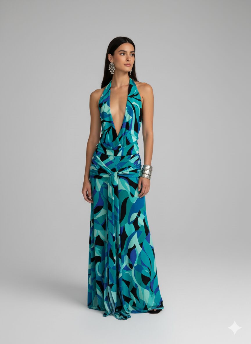 El Ambar Dress trae el estampado Calypso en una silueta halter con un escote en V profundo y dramático. El elegante nudo central crea un fruncido favorecedor, asegurando que te veas inolvidable y espectacular de sol a sol.