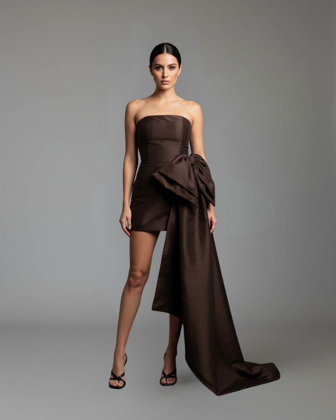El “Vestido Barbie” es una pieza que busca causar un impacto con su atractivo color. Presenta una silueta mini sin tirantes. Su estilo ajustado abraza el torso de forma favorecedora y añade un toque romántico. La falda del vestido tiene un lazo exagerado que cae dramáticamente sobre la pierna. El material es 100% seda y no se estira. Cierre con cremallera en la parte trasera.