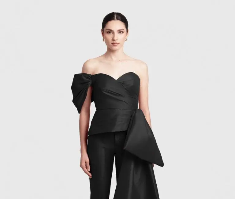 El “Bow Down Midi Dress” es una silueta clásica de un solo hombro que se destaca por su moño exagerado sobre el hombro y su abertura en la pierna. Su cierre se encuentra en la parte de atrás.