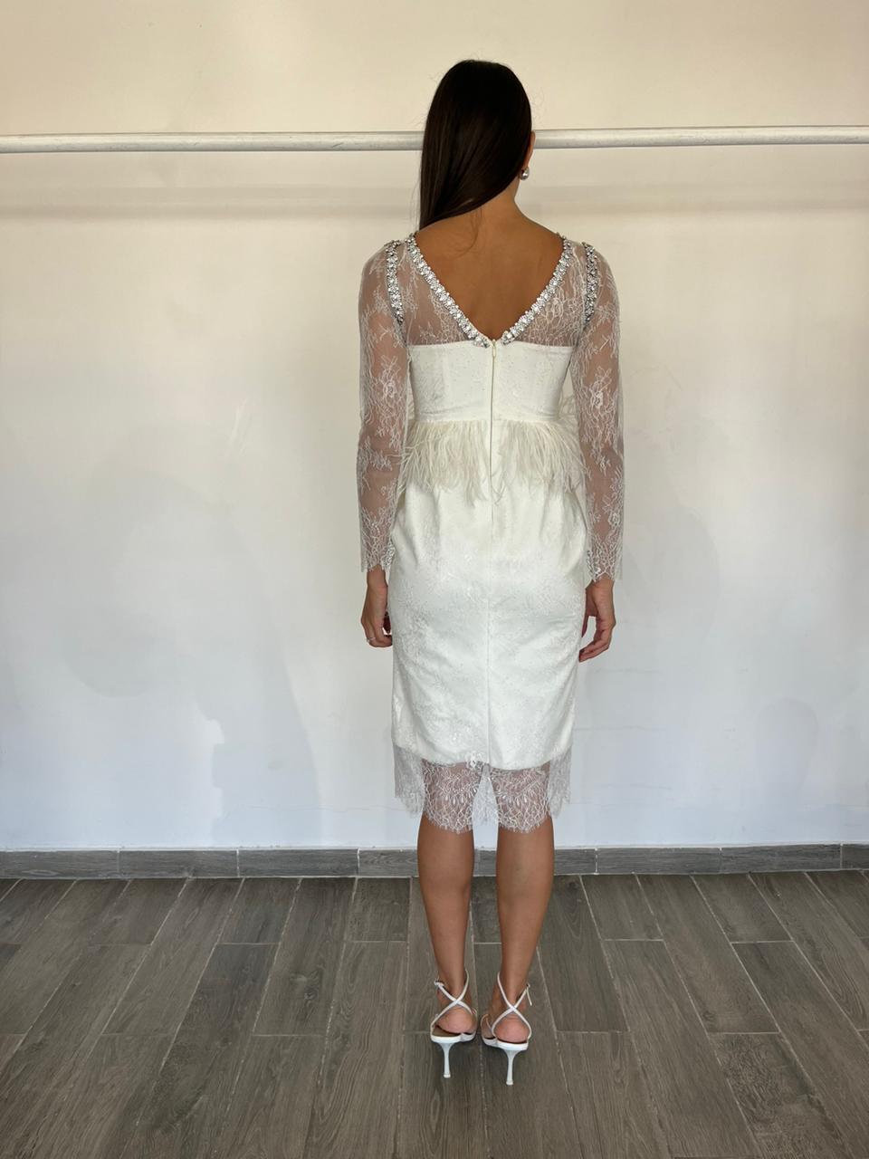 El “Feather Me Not Dress” es un vestido midi con escote de corazón y mangas de encaje, con detalles de plumas. Importante: Esta prenda forma parte de nuestra sección OUTLET. Por esta razón, no se aceptan cambios ni devoluciones.