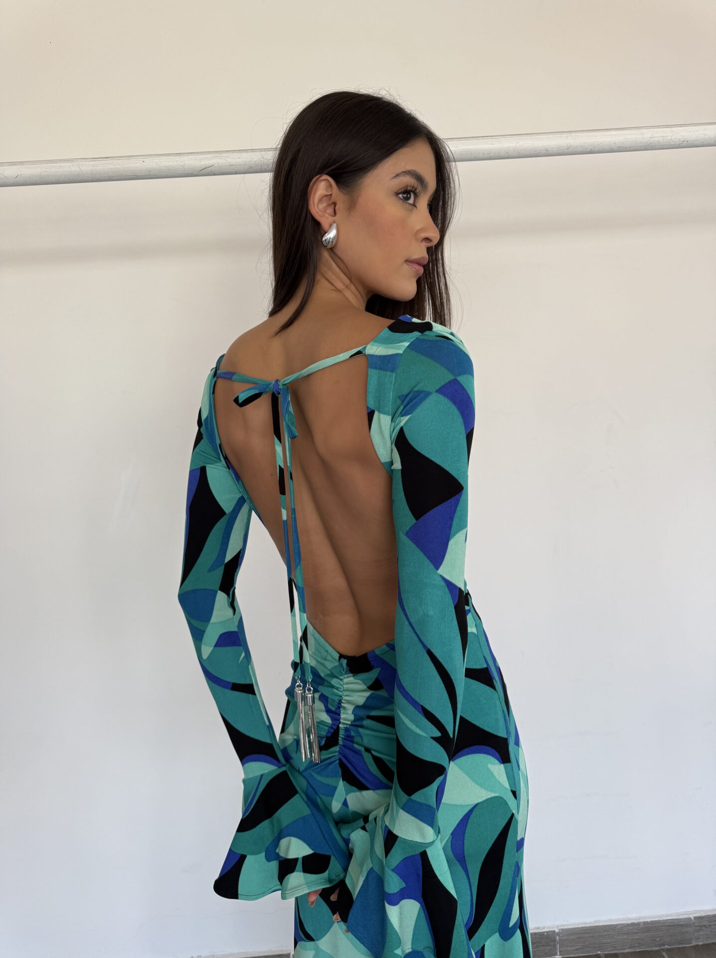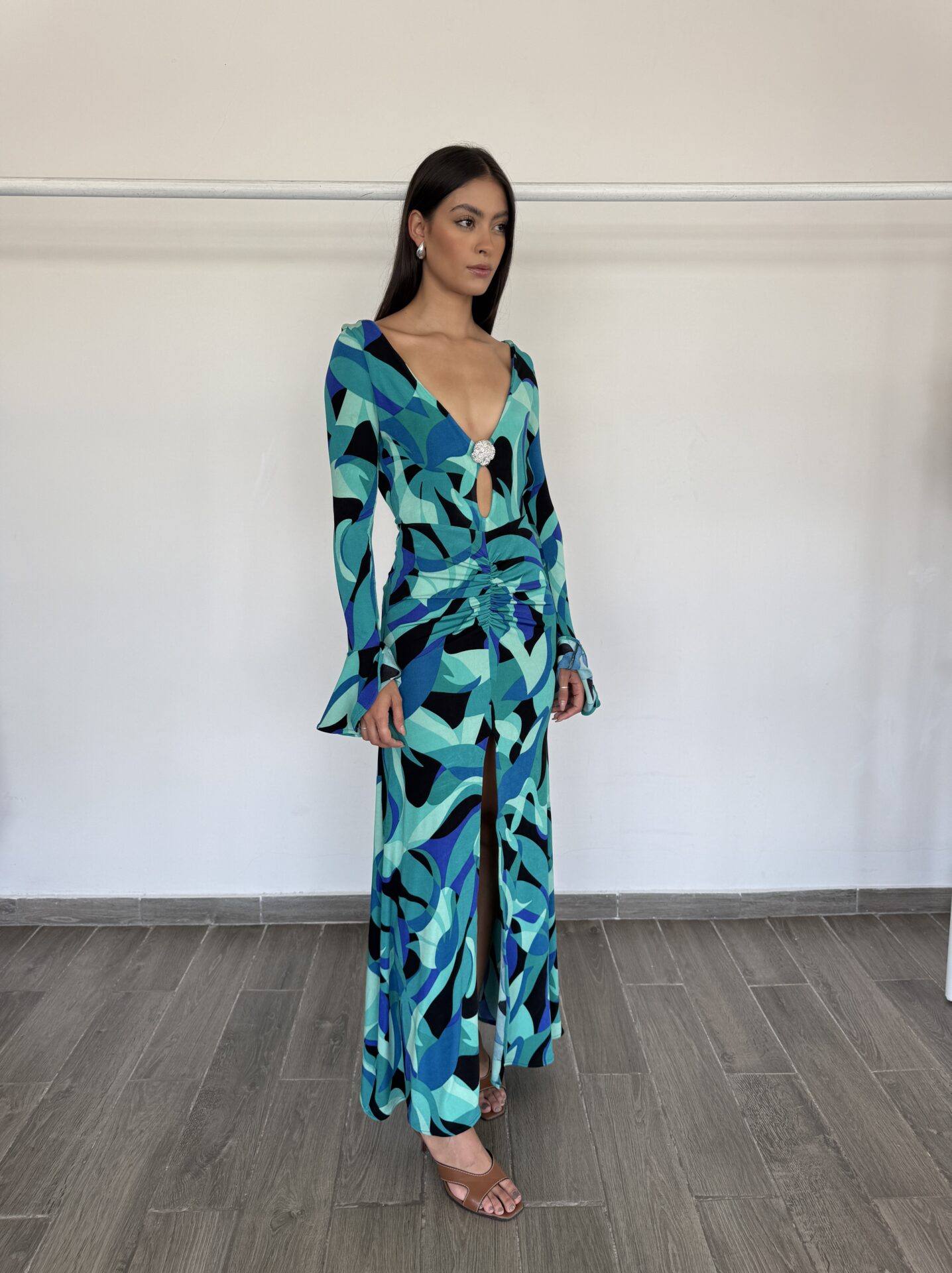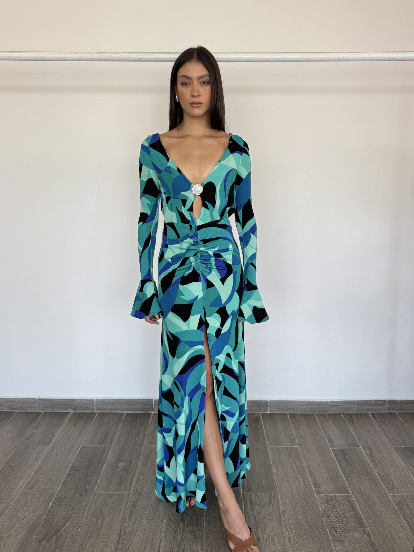 El Imani Dress con el print Calypso tiene un escote en V profundo con una hebilla brillante de pedrería que enmarca un sutil cut-out. Trae espalda abierta y falda fluida con puños acampanados y fruncido central, te asegura un look de impacto diseñado para brillar en cualquier ocasión especial.