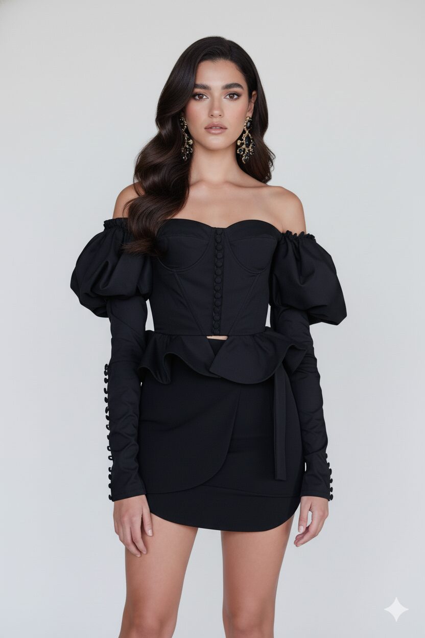 “The Little Top From The Prairie in Black” es la definición de romanticismo con su top estilo bustier decorado con su río de botones que lo enmarcan y para hacerlo mas especial cuenta con mangas abullonadas y un corte acampanado en la parte inferior. Viene con una cremallera metálica en la parte trasera para cerrar.
