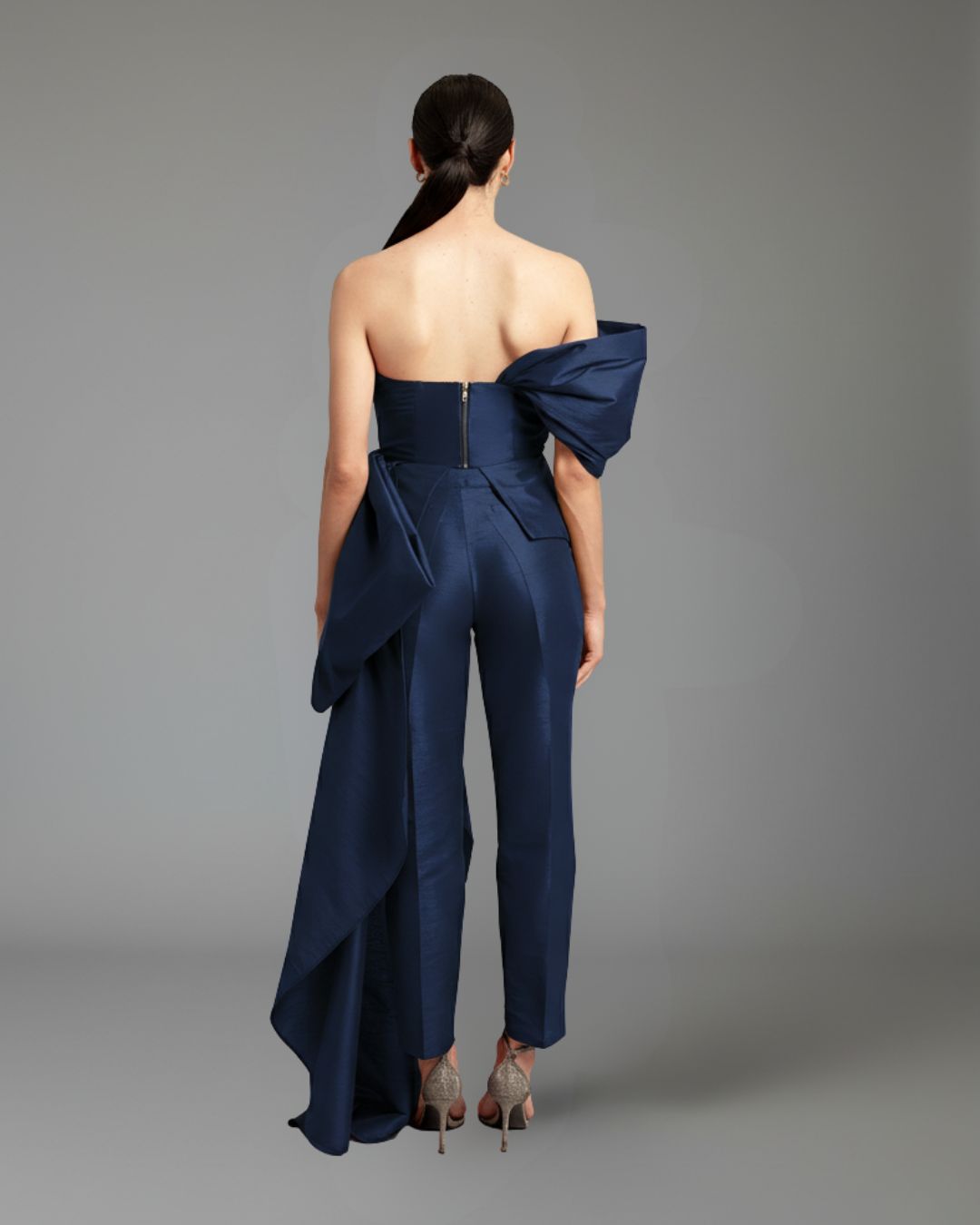 El “Monroe Set” es el indicado para una entrada triunfal. Presenta un top drapeado sin tirantes con un dramático moño al lado que cae hasta el suelo de forma dramática e intensa. También viene con unos pantalones estilo cigarrete.