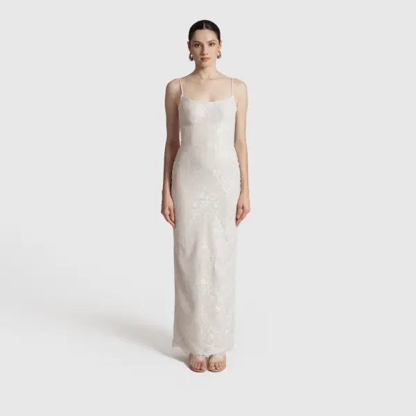 El “Diana Lace Dress” de encaje combina estructura suave y feminidad. Su escote cuadrado con tirantes curvos aporta un toque moderno, mientras la cintura tipo corset define la silueta con sutileza. De largo elegante que deja ver los tobillos, es ideal para la novia contemporánea.
