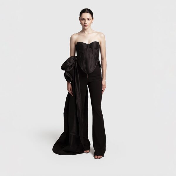Este corset ajustado presenta copas con bordes afilados que crean un efecto dramático y llamativo. Añadiendo un toque de glamour, el top está adornado con un gran moño voluminoso en un costado. Se completa con una falda superpuesta de largo hasta el suelo en un lado. El corset se cierra de manera segura en la parte posterior.