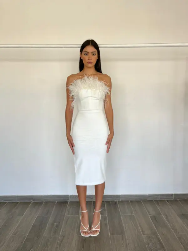 El “Feather Bombshell Dress in Ivory” presenta un vestido midi strapless que abraza todas las curvas. Cuenta con una abertura al lado y para el toque de drama cuenta con plumas a lo largo del escote. Cierre en la parte de atrás. Importante: Esta prenda forma parte de nuestra sección OUTLET. Por esta razón, no se aceptan cambios ni devoluciones.